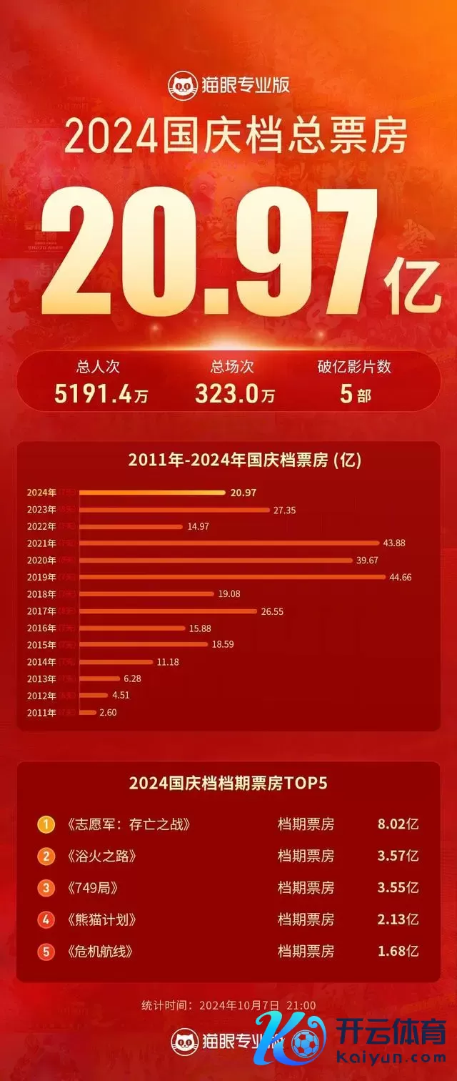 本年国庆档,中国电影(600977)阛阓迎来了不雅影振作。据猫眼专科版数据,为止10月7日21时,国庆档总票房达到20.97亿,不雅影东谈主次5191万,总场次323万。在多部影片中,有5部作品胜仗破亿,与旧年破亿影片数目执平。