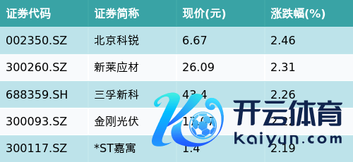 范围收盘现金九游体育app平台,HJT电板主题涨跌幅最高的五只股票为:北京科锐(002350.SZ)、新莱应材(300260.SZ)、三孚新科(688359.SH)、金刚光伏(300093.SZ)与*ST嘉寓(300117.SZ)。笃定见下表: