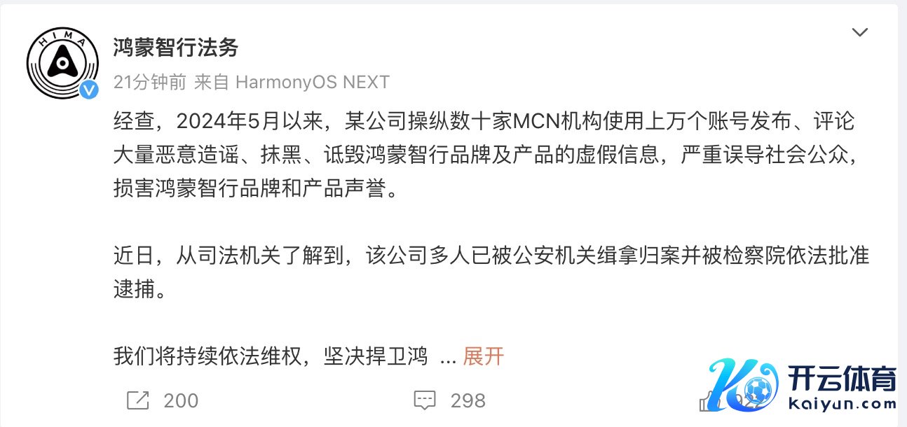 3月4日晚间,鸿蒙智行法务微博发布:经查,2024年5月以来,某公司主宰数十家MCN机构使用上万个账号发布、评述多数坏心诽谤、抹黑、谩骂鸿蒙智行品牌及产物的盘曲信息九游体育app娱乐,严重误导社会公众,损伤鸿蒙智行品牌和产物声誉。